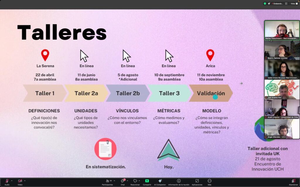 La asamblea también revisó los principales hitos recientes de la Red, entre ellos la difusión de la declaración pública dirigida a las candidaturas presidenciales 2025, la participación en reuniones de trabajo con ANID y la Subsecretaría de Ciencia, Tecnología, Conocimiento e Innovación, además de la realización del taller junto a la investigadora internacional Elvira Uyarra en el marco del 3er Encuentro de Innovación de la Universidad de Chile. En materia comunicacional, se presentó la nueva imagen de la Red, se anunció la publicación periódica de columnas de opinión y se informó sobre la actualización del sitio web institucional.